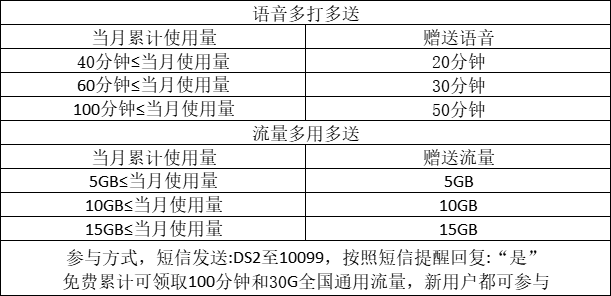 广电双百卡2.0 100G产品专属充值链接:https://m.10099.com.cn/h5wap/recharge;快递员处的专属渠道首充50元享受月租26优惠/首充100元享受月租24优惠/首充200元享受月租19优惠,不充值无法触发优惠(具体资费请见详情介绍)。广电100分钟语音多大多送+30G流量多用多送活动2免费参与方式【短信发送:DS2至10099,按照短信提醒回复:“是” 免费累计可领取100分钟和30G全国通用流量,新用户都可参与】