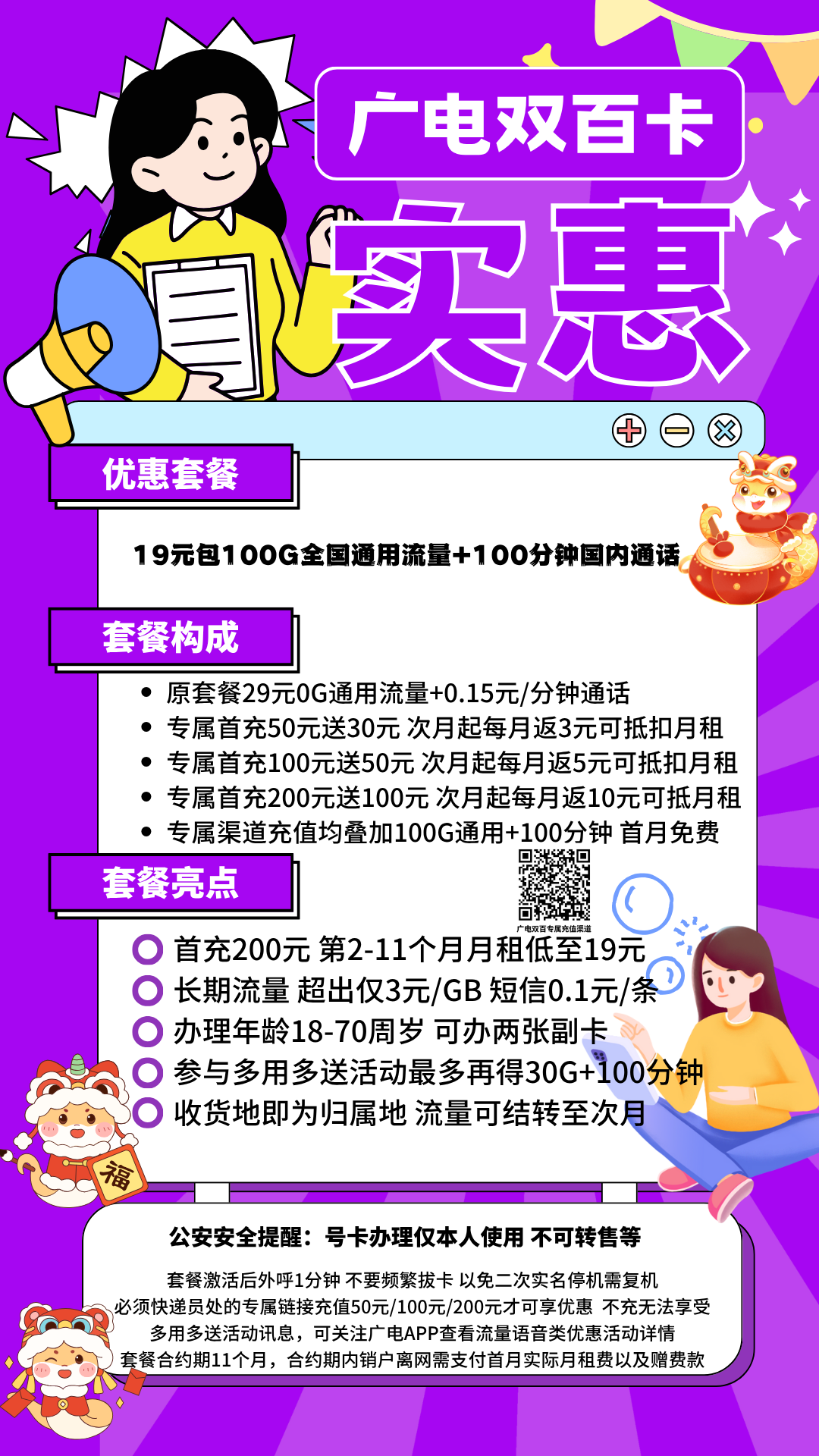 下单前请务必扫码查看手机终端设备是否支持广电卡!全平台所有号卡产品均为4G套餐,切记均不可宣传5G套餐!本产品也为4G套餐,是否支持5G信号/网络请以实际使用为准!原套餐29元,通话0.15元/分钟,短信/彩信:0.1元/条,流量超出:3元/G,赠来电显,副卡10元/张/月(副卡流量共享,分钟不共享)可办理2张;专属充值50送30,充值100元送50元,充值200元送100元,次月起分10个月返还3/5/10元/月(即首月免费+第2-11个月月租26/24/19元,后续长期29元),每月叠加100G通用流量+100分钟长期优惠!未首充或者其他渠道充值,套餐无法生效优惠,无短信和语音功能