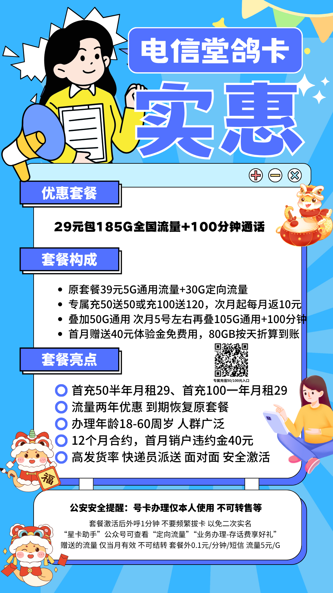 卖点: 激活当月80G按天折算免费体验(次月5号左右叠加至185G流量+100分钟) 专属充值50或100月租半年或一年29 流量两年套餐 18-60周岁 支持补