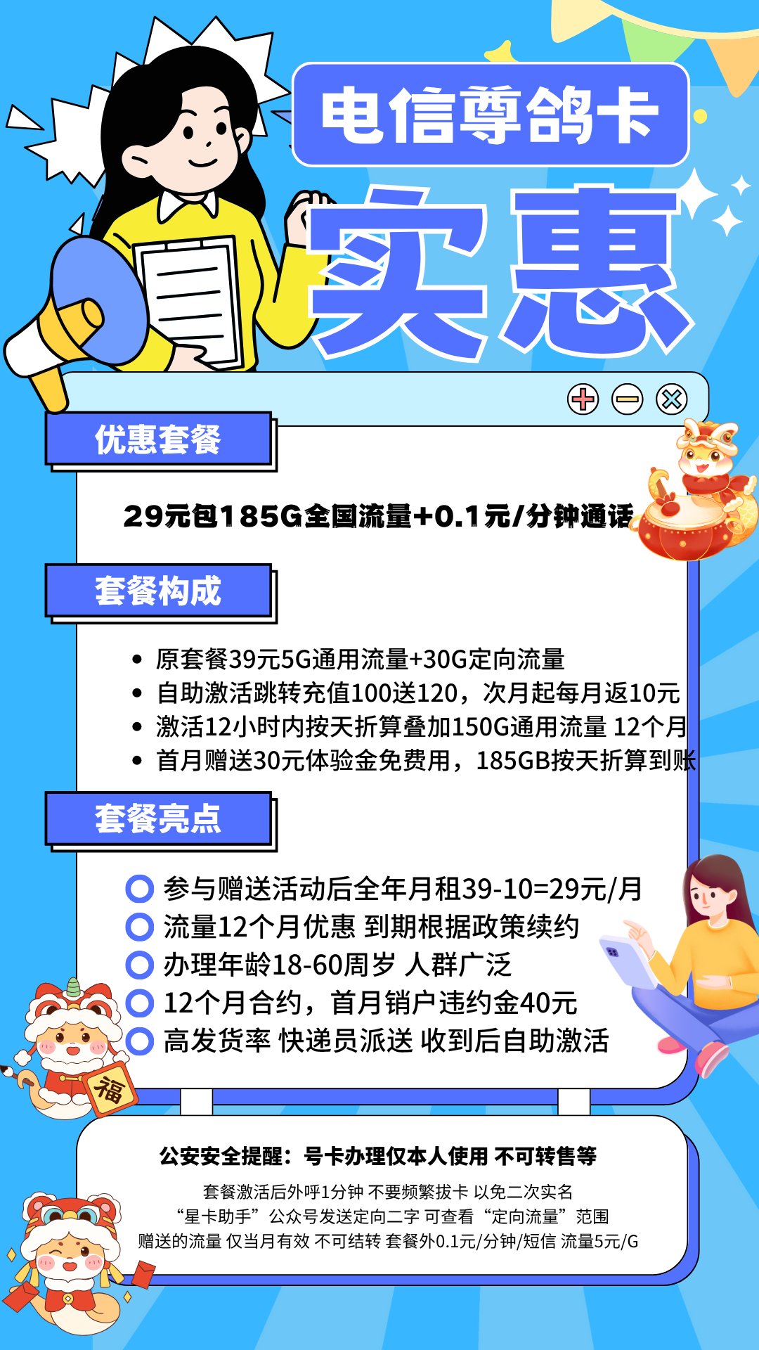 全平台所有号卡产品均为4G套餐,切记均不可宣传5G套餐!本产品也为4G套餐,是否支持5G信号/网络请以实际使用为准!原套餐39元5G通用+30G定向流量+0.1/分钟(首月免费 赠送体验金当月有效 按天折算抵扣费用、首月185G流量折算到账)自助激活专属渠道充值100元享优惠(跳转充值100元送120元,次月起每月赠送10元,共12个月(不充值不享受),到期根据运营商政策续约,可关注归属省公众号活动;), 29元155G通用+30G定向+0.1元/分钟(无分钟赠送优惠请知悉),激活12个小时内自动再叠加150G通用流量 按剩余天数折算 共计155G通用流量+30G定向流量 官方可查12个月,到期根据政策续约,首月29元185G+0.1元/分钟流量185G按天折算到账不超套餐免费使用,第2-12个月每月29元185G全国流量+0.1元/分钟到期根据运营商政策续约 ;2025年11月30日前限量发售,先抢先得随时下架!套餐激活后外呼1分钟 不要频繁拔卡 以免二次实名;定向流量关注“星卡助手”公众号回定向二字查看详情;赠送的流量 仅当月有效 不可结转 套餐外0.1元/分钟/短信 流量5元/G;有任何疑问可咨询店铺客服!